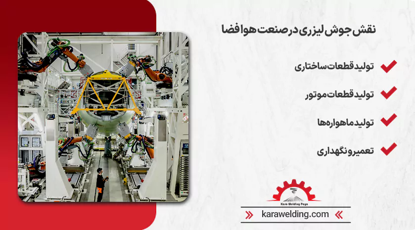در صنعت هوافضا برای تولید کردن قطعات ساختاری هواپیما مثل بدنه، بالها و اجزای داخلی هواپیما از جوش لیزری استفاده می کنند.