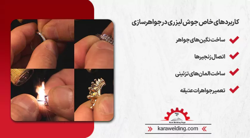 جوش لیزری در جواهرسازی در زمینههای مختلفی به کار میرود که میخواهیم به چند مورد از این زمینهها اشاره کنیم: